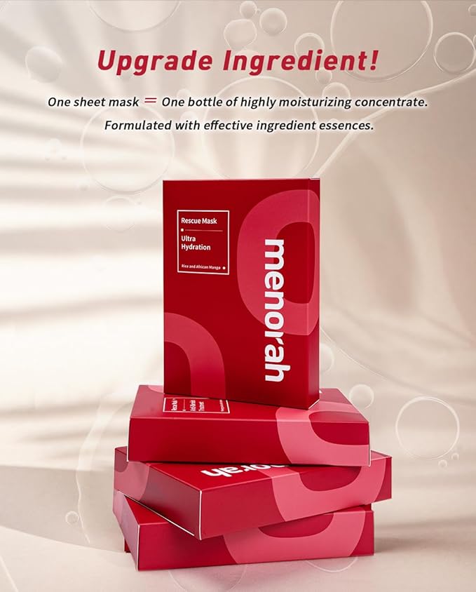 menorah skincare - Ultra Hydration Rescue Sheet Mask (4 Sheets) - with Rice, African Mango, Face sheet masks, Moisturizing mask, Super Hydration and Moisturizing, 100% Organic cotton sheet mask