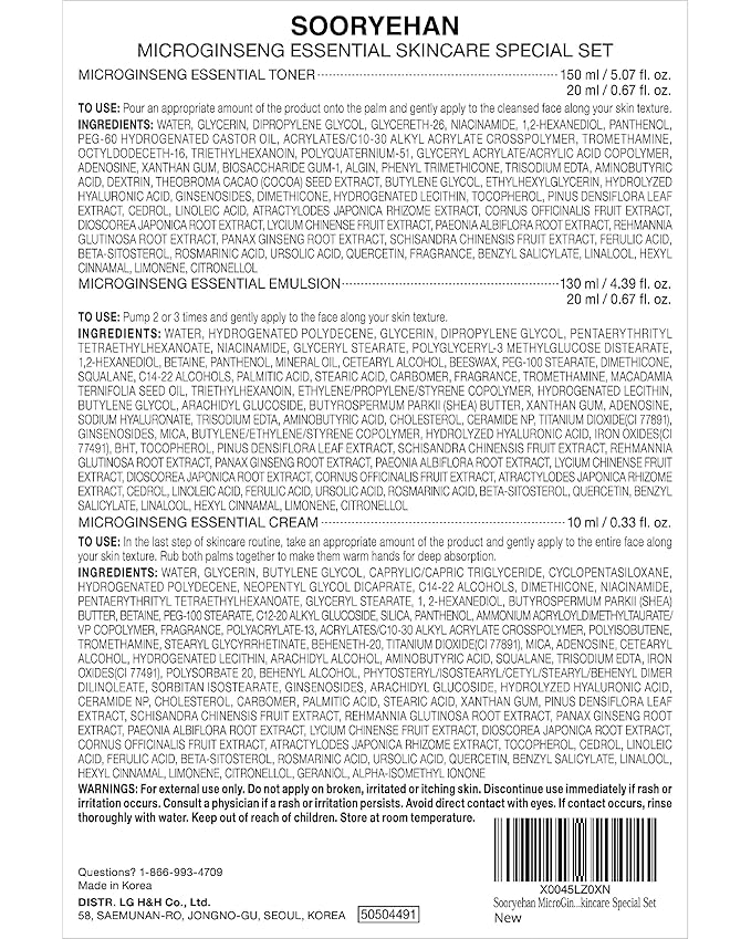 - SOORYEHAN MICRO GINSENG ESSENTIAL SKINCARE SPECIAL SET - Essential Skin (5.0 fl oz + 0.67 fl oz) & Essential Emulsion (4.4 fl oz + 0.67 fl oz) & Essential Cream (0.34 fl oz). This luxurious skincare set harnesses the power of Micro Ginseng and advanced herbal ingredients to boost skin density and elasticity. Formulated to deeply nourish and revitalize, it delivers essential moisture for a radiant and youthful complexion.