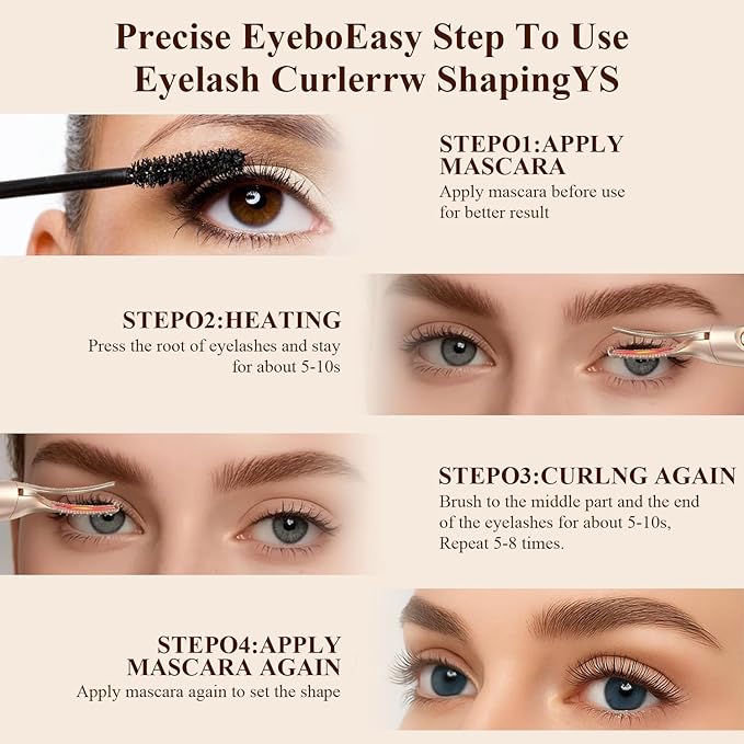 - β‘ Fast 10-Second Heating β The 2-in-1 electric eyebrow trimmer and electric eyelash curler, preheats in just 10-20 seconds for instant, long-lasting curls that stay lifted all day. The 15Β° curved brush head enhances mascara application for extra volume