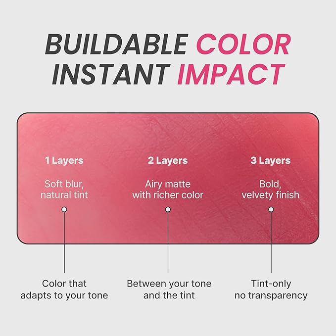 - Long-Lasting Velvet Matte: Buildable tint with a soft-blur finish, enriched with Peptide Complex, Panthenol, and Aloe Vera to soothe and support lip health.